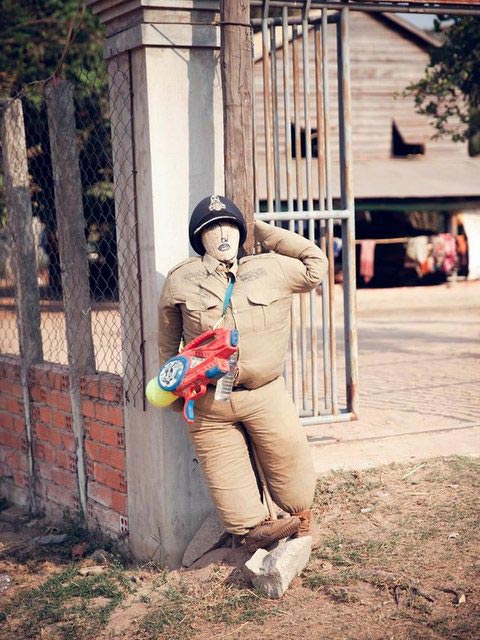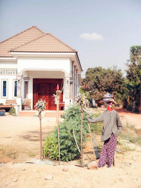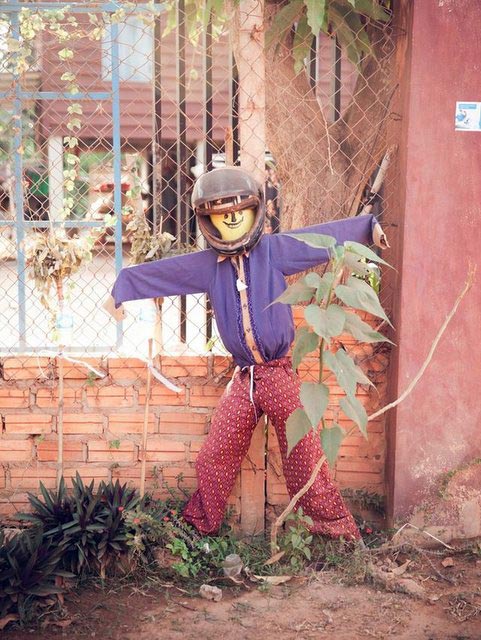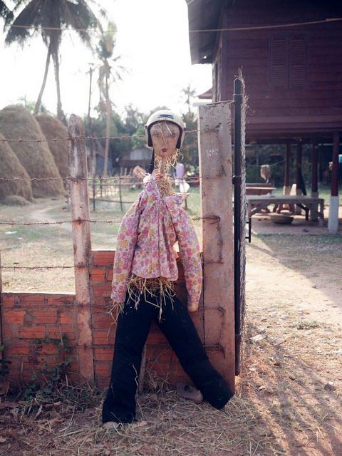 This 2011 article from the Phnom Penh Post explains more about the practice. “People were getting sick and at night the dogs were whimpering a lot,” [a villager in Banteay Srey district] confided. “All of my neighbors and I went to a fortune teller in the next village who told us it was happening because ghosts were going into the village and causing illness. It’s an old tradition that if you put a ting mong in front of your house the ghosts will see it and be afraid of it, but it has to wear clothes like a human, or have weapons, so the ghost thinks the house is being guarded by a person.”