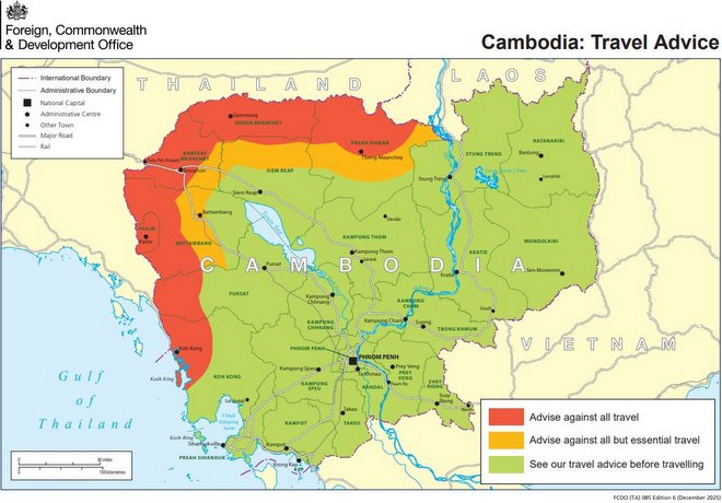 Most government travel websites advise against travel within 50km of the Cambodia-Thailand border. For reference, major tourist area Siem Reap is approximately 200km from the border, and Phnom Penh is even further away. Several governments have included heat maps that suggest reconsidering travel to slightly further inland, just including Battambang. I personally would not be afraid to go to Battambang, but if you’re an anxious visitor you could give it a miss.